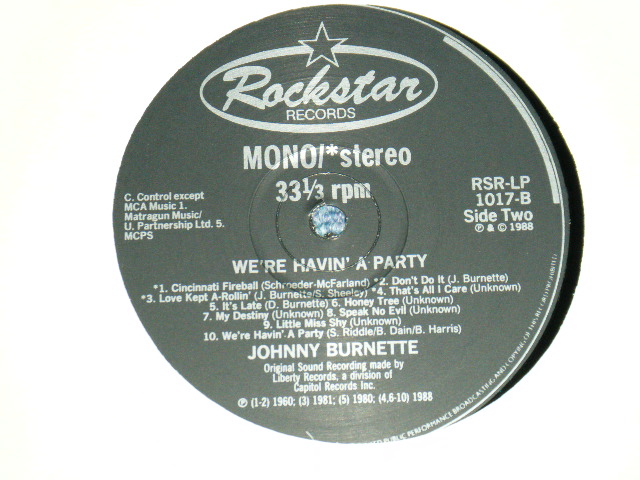 JOHNNY BURNETTE - WE'RE HAVIN' A PARTY (NEW) / 1988B UK ENGLAND ORIGINAL "BRAND NEW" LP[ROCKSTAR RSR-LP 1017]